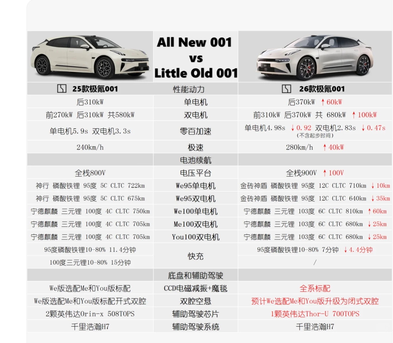在核心的性能动力层面,26款极氪001的提升堪称“激进”。单电机版本后电机功率从25款的310kW提升至370kW,零百加速时间从5.9秒缩短至4.98秒,首次迈入“4秒俱乐部”;双电机版本升级更为显著,前电机从270kW增至310kW、后电机从310kW增至370kW,综合功率达到680kW(较老款提升100kW),零百加速仅需2.83秒(不含起步时间,实测预计3秒左右),马力更是达到925匹,结合极氪过往“反向虚标”的特点,轮上马力突破千匹的可能性极大。此外,车辆极速从240km/h提升至280km/h,高速行驶性能进一步增强,满足了部分用户对驾驶激情的追求。