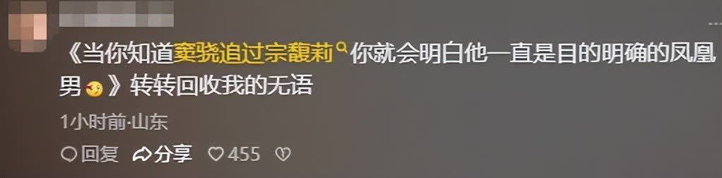 随即,在有关窦骁的视频下面,总有一句热评是“当你知道窦骁追过宗馥莉,你就会明白他一直是目的明确的凤凰男”。